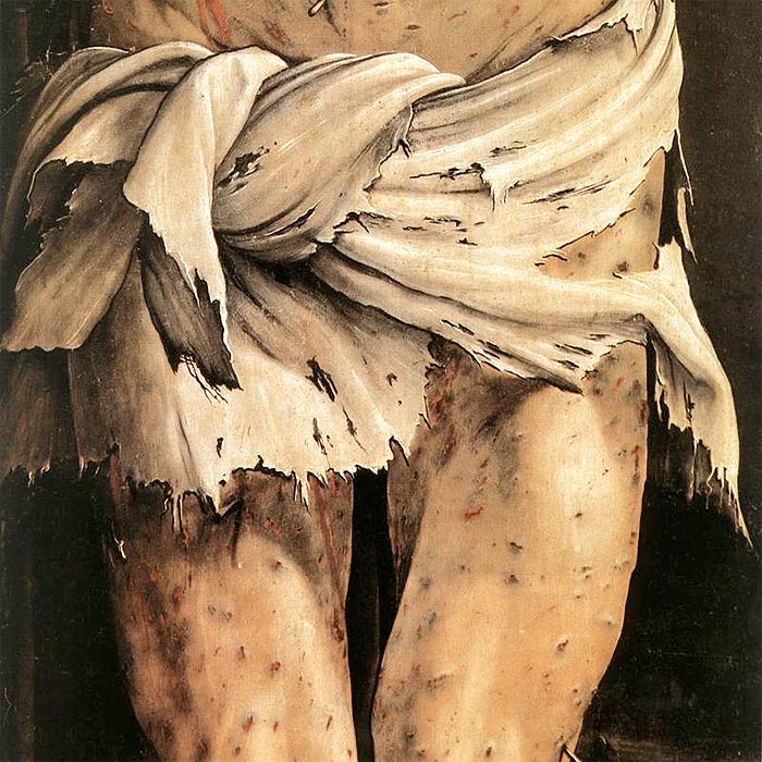The Isenheim Altarpiece by Mattias Grunewald depicts a resurrection that is born of the horrific, cauterizing crucible of the suffering-cross; complete, beautiful, triumphant, yet wounded, fully identifying with our humanity. The patients of a hospice would come everyday to pray where the painting was. Knowing who the audience for his painting would be, Grünewald actually depicted Christ with plague-type sores (as you can see in the second photo), to show symbolically that Jesus understood and shared their afflictions.